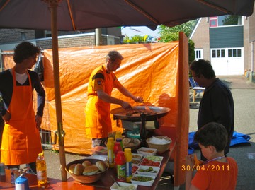 Koninginnedag 2001 op het Dorpsplein. Het praten, drinken en spelen kan je alleen maar volhouden als er af en toe iets gegeten word: Hamburgers en HotDog's. foto: Chris Buzink